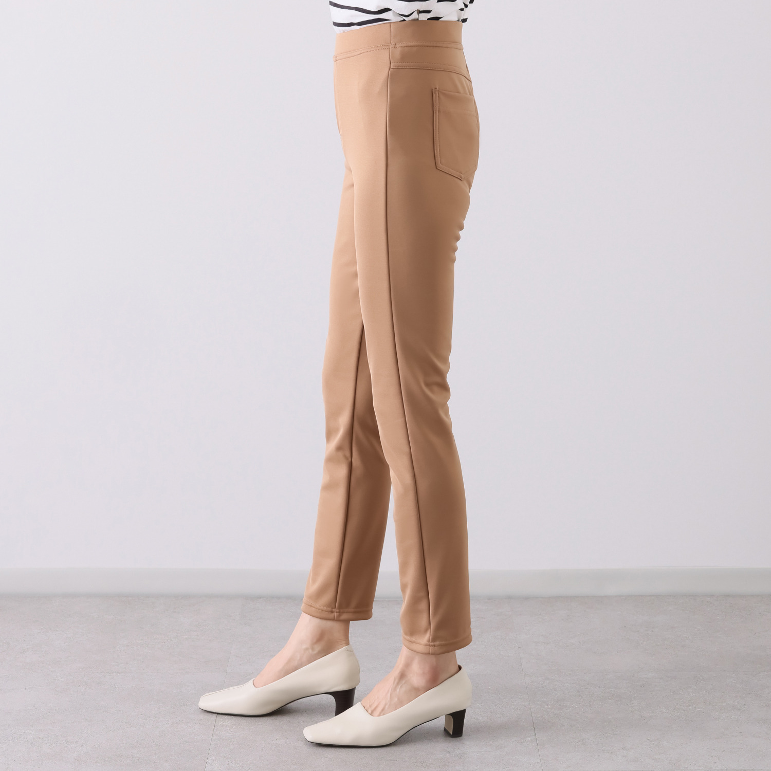 脇線をややフロント寄りに配すことで、すっきりとした脚のラインを演出。